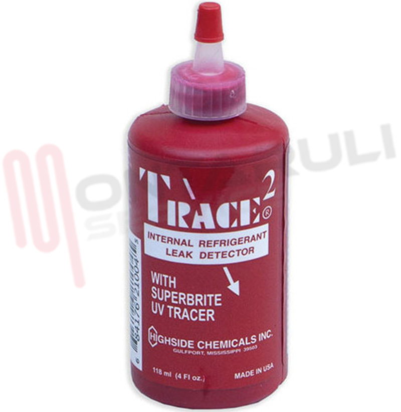 Ecco il testo riscritto integralmente in maiuscolo, come richiesto: TRACCIANTI PER IDENTIFICAZIONE PERDITE: TRACCIANTI PER LOCALIZZARE LE PERDITE NEI CIRCUITI FRIGORIFERI, COLORANTE CONCENTRATO FLUORESCENTE DI COLORE ROSSO, DI FORTE PENETRAZIONE, COMPATIBILE CON TUTTI I REFRIGERANTI E CON TUTTI I LUBRIFICANTI TIPO MINERALE MO E AB. LA SECONDA VERSIONE È A BASE POLYESTERE E COMPATIBILE CON TUTTI GLI OLII MINERALE E SINTETICI. FLUORESCENTE CON QUALSIASI FASCIO DI LUCE ULTRAVIOLETTA UV. MADE IN USA
