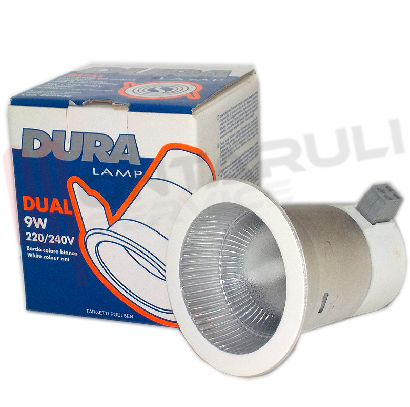 LAMPADA DURALAMP MODELLO DUAL DUO390 FLUORESCENTE 9W 220-240V 5060HZ 2700K LUCE CALDA, DA INCASSO CON OTTICA AD ALTA RIFLETTENZA E SCHERMO DI PROTEZIONE IP44.
