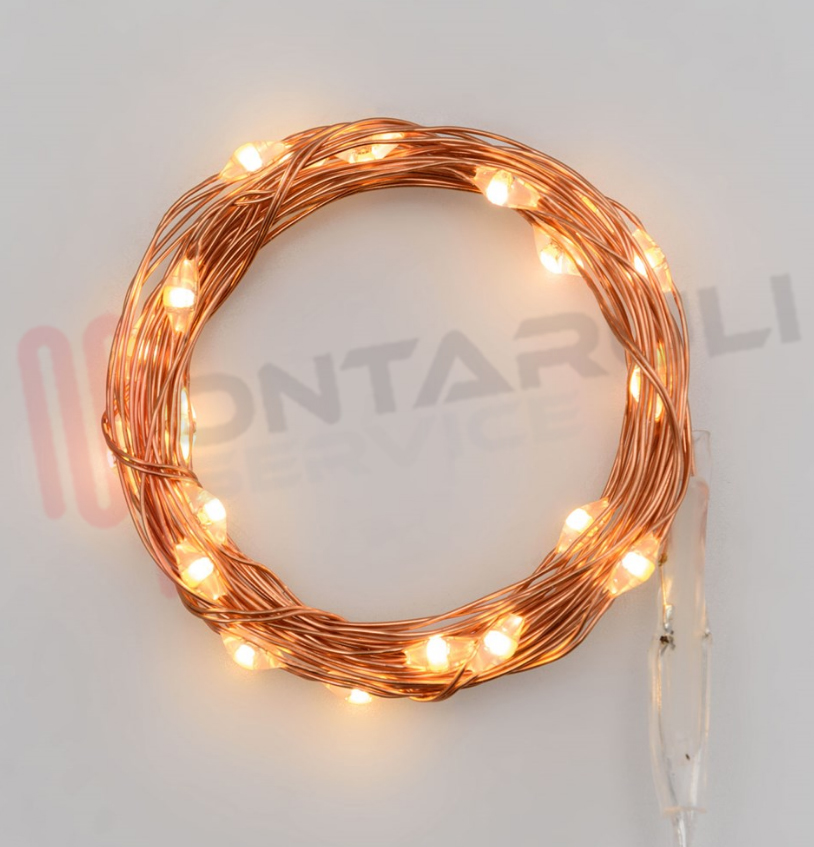 CATENA DI 20 MICRO LED LUCE FISSA CALDA CLASSIC CON CAVO IN METALLO COLOR RAME 1,9MT + 10CM. DI CAVO ALIMENTAZIONE, A BATTERIE ( 2XCR2032 ) BATTERIE NON INCLUSE, USO INTERNO, LUCE FISSA.
