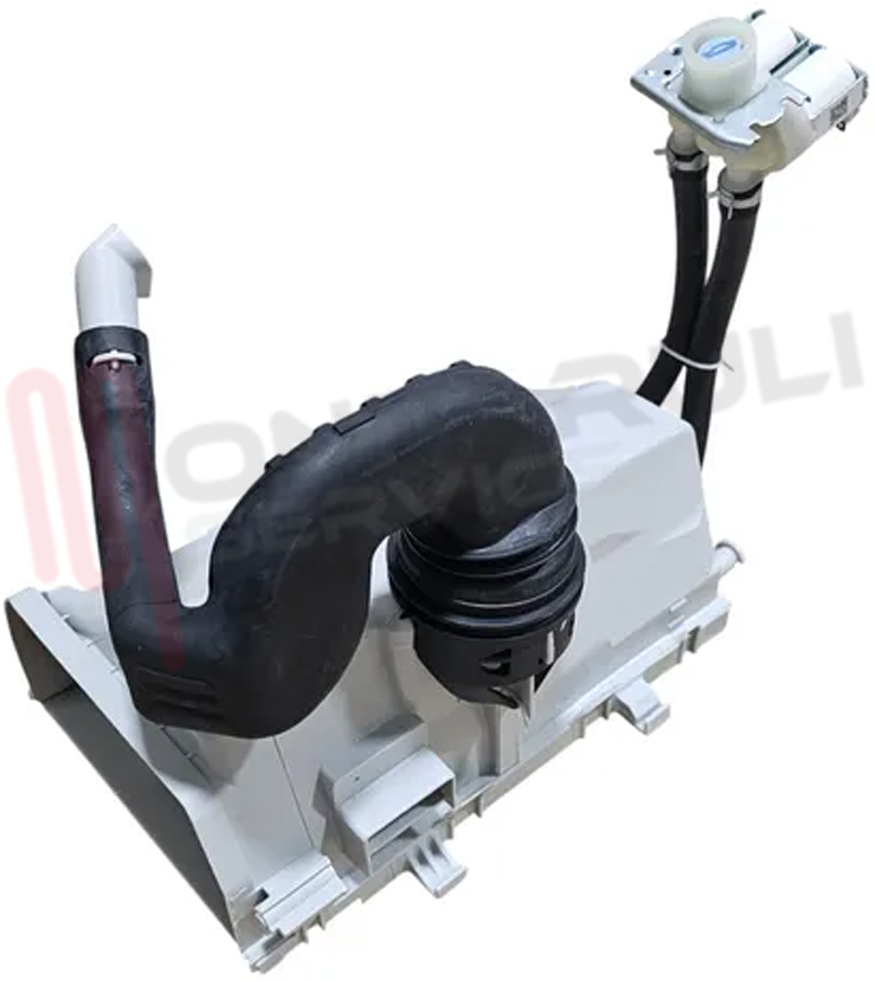 ASSIEME TRAMOGGIA COMPLETA DI DOPPIA ELETTROVALVOLA 12V DC CON TUBI E MANICOTTO SENZA CASSETTO VASCHETTA INTERNA PER LAVATRICE LG ORIGINALE